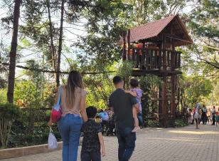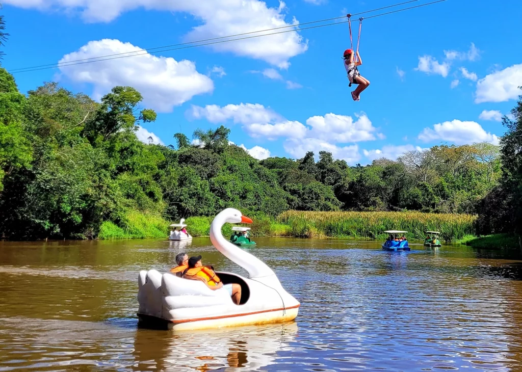 Além da tradicional comida caseira feita no fogão a lenha, a fazenda conta com atrações para todas as idades, como pedalinho, tirolesa, arvorismo, passeio de mini pônei e muito mais.